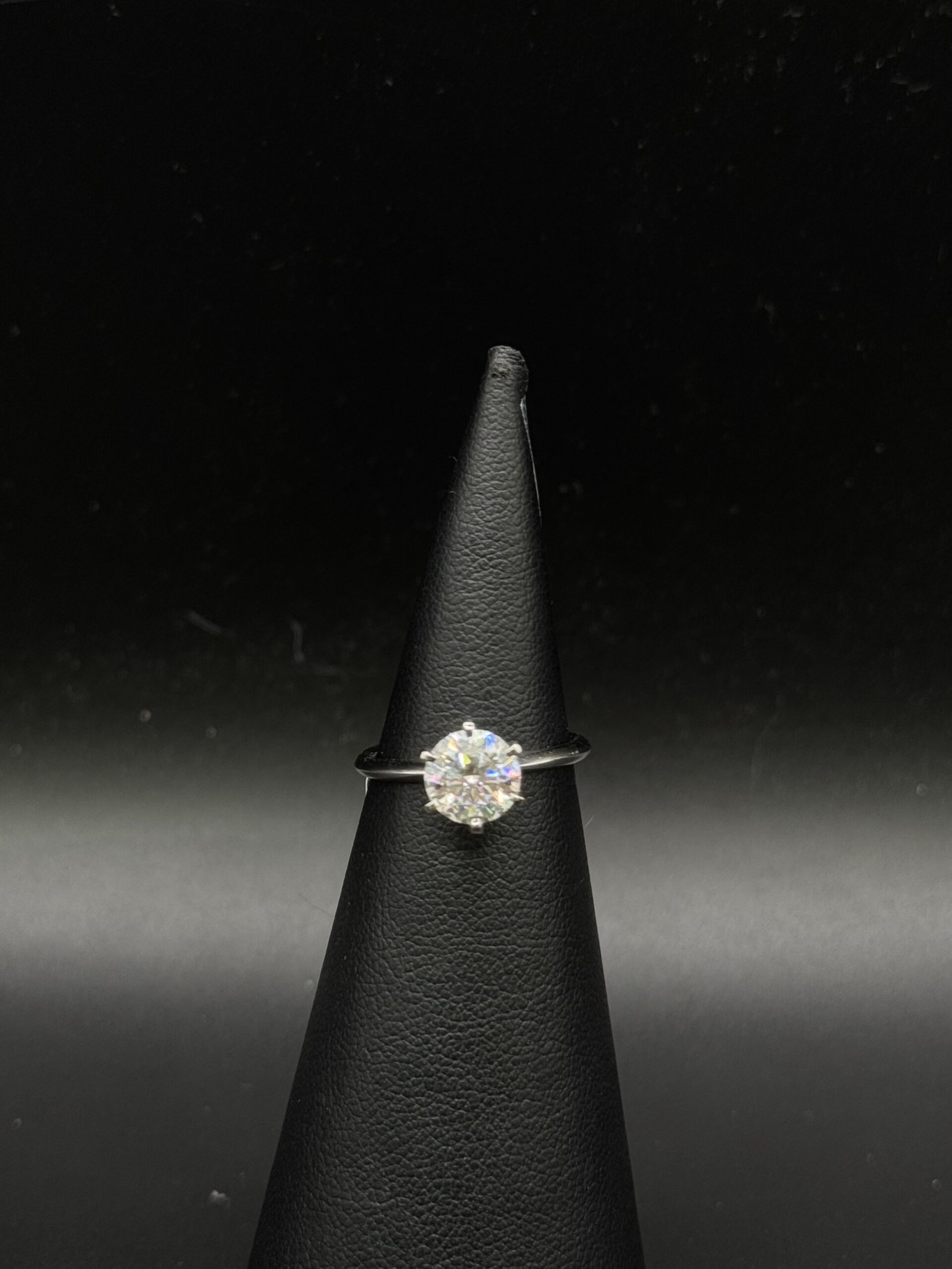 Elegant and timeless, this 18K white gold engagement ring features a stunning Mondavhie stone. Weighing 2.9 grams...