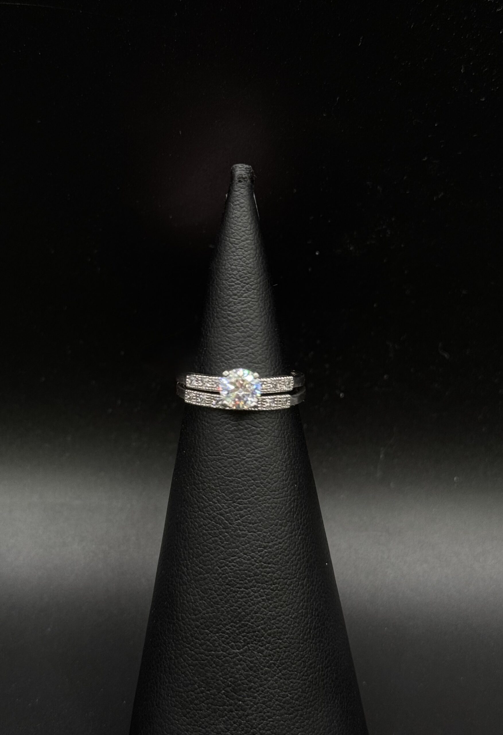 Elegant and modern, this platinum bridal set features a total of 1.50 CTW lab-grown diamonds, combining a 1.00 CT center stone with 0.50 CTW of accent diamonds. Weighing 7.56 grams and sized at 6.5, it offers timeless brilliance and lasting sophistication.
